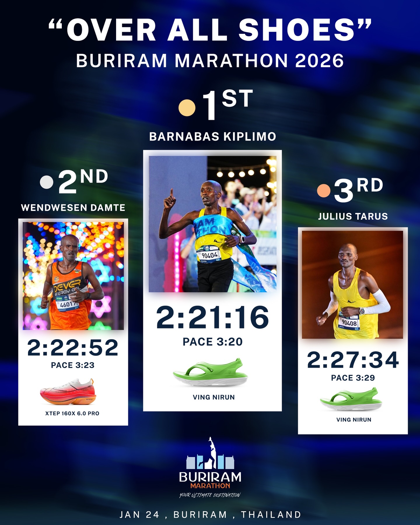At Buriram Marathon 2026, runners wearing VING NIRUN Marathon Sandal achieved 1st and 2nd place in the full marathon (42K) — not as an experiment, but as real race performance.